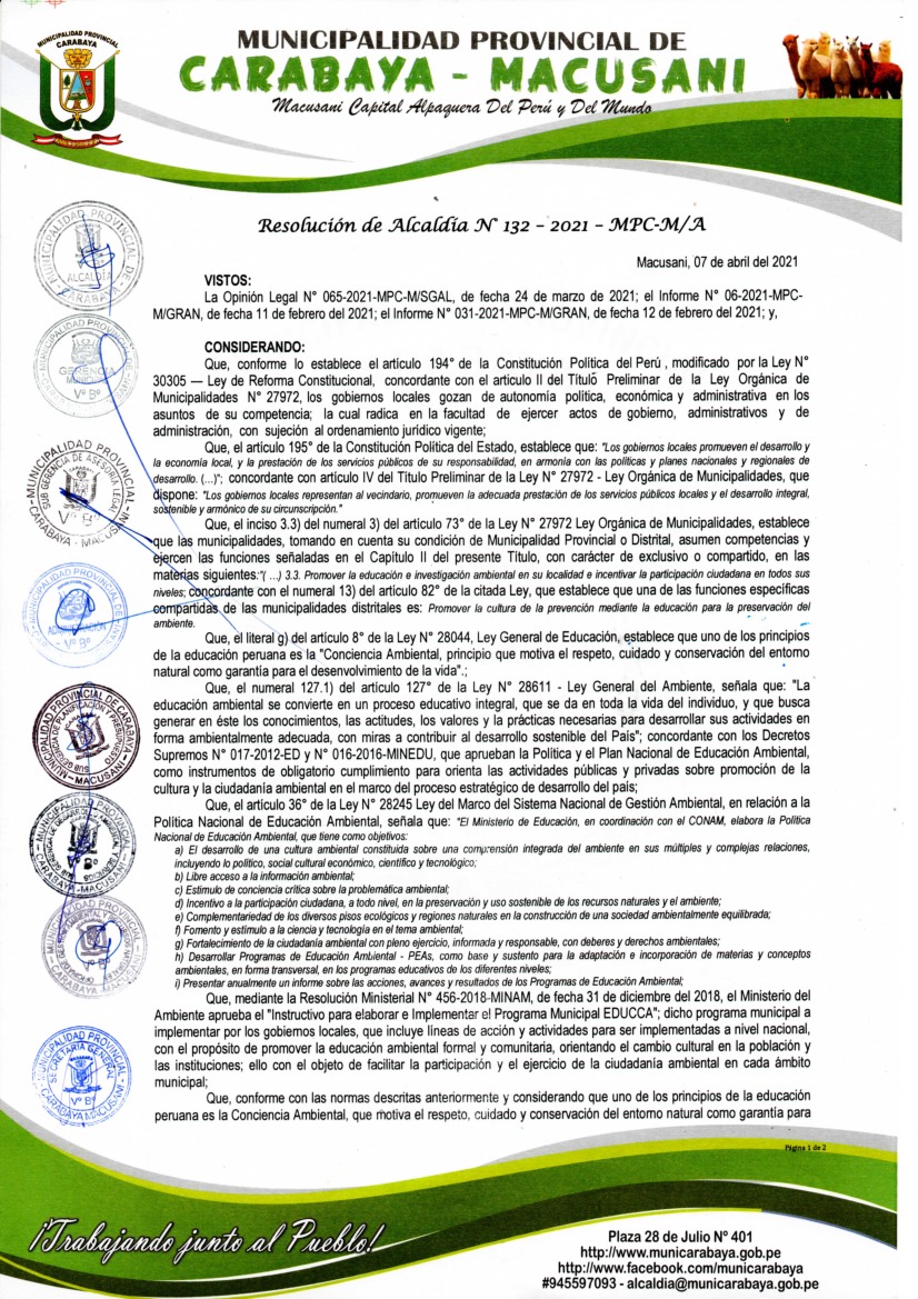 La presente Resolución aprueba el Programa Municipal de Educación, Cultura y Ciudadanía Ambiental de la Municipalidad Provincial de Carabaya, para el periodo 2021- 2022; con la finalidad de promover la cultura y la educación ambiental para la formación de ciudadanas y ciudadanos ambientalmente responsables e incentivar la participación ciudadana en todos sus niveles.