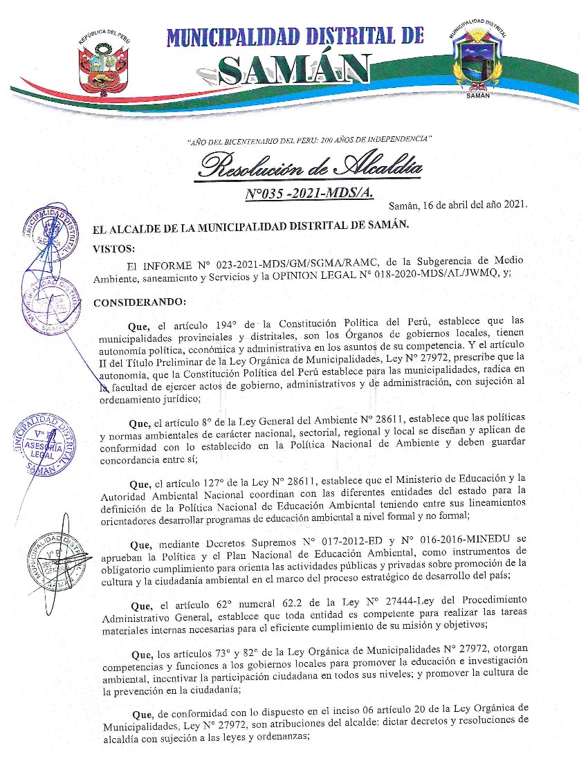 La presente Resolución aprueba el Programa Municipal de Educación, Cultura y Ciudadanía Ambiental de la Municipalidad Distrital de Samán, para el periodo 2021- 2022; con la finalidad de promover la cultura y la educación ambiental para la formación de ciudadanas y ciudadanos ambientalmente responsables e incentivar la participación ciudadana en todos sus niveles.