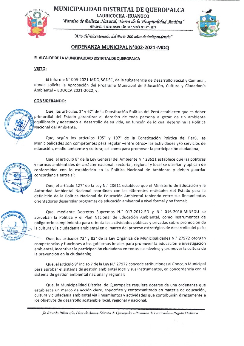 La presente Ordenanza aprueba el Programa Municipal de Educación, Cultura y Ciudadanía Ambiental de la Municipalidad Distrital de Queropalca, para el periodo 2021 - 2022; con la finalidad de promover la cultura y la educación ambiental para la formación de ciudadanas y ciudadanos ambientalmente responsables e incentivar la participación ciudadana en todos sus niveles.