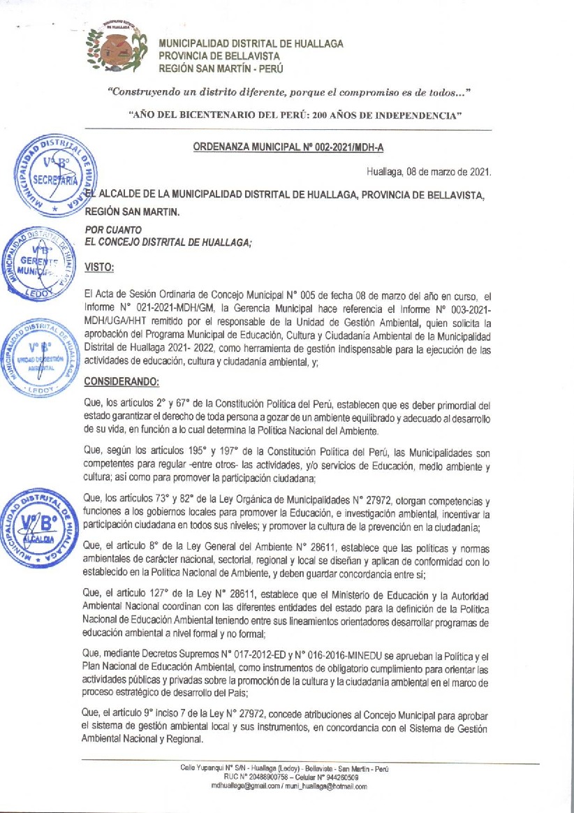 La presente Ordenanza aprueba el Programa Municipal de Educación, Cultura y Ciudadanía Ambiental de la Municipalidad Distrital de Huallaga, para el periodo 2021 - 2022; con la finalidad de promover la cultura y la educación ambiental para la formación de ciudadanas y ciudadanos ambientalmente responsables e incentivar la participación ciudadana en todos sus niveles.