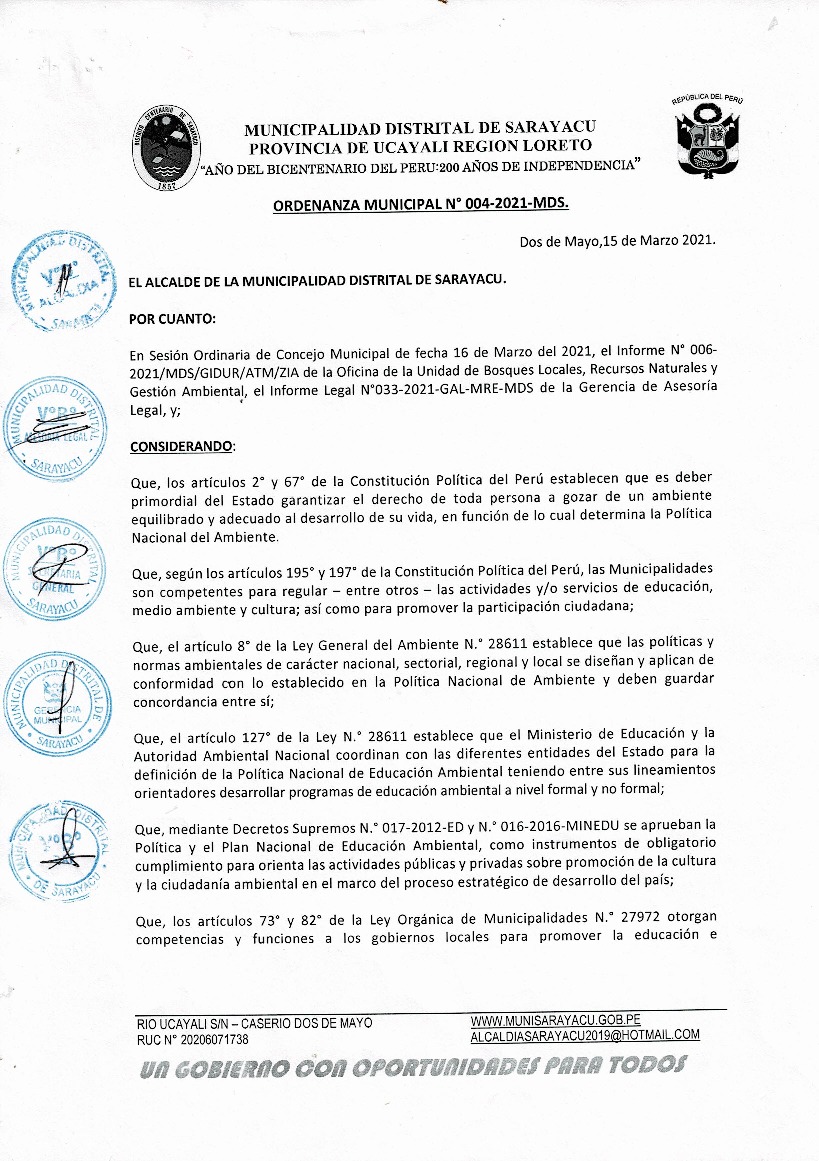 La presente Ordenanza aprueba el Programa Municipal de Educación, Cultura y Ciudadanía Ambiental de la Municipalidad Distrital de Sarayacu, para el periodo 2021 - 2022; con la finalidad de promover la cultura y la educación ambiental para la formación de ciudadanas y ciudadanos ambientalmente responsables e incentivar la participación ciudadana en todos sus niveles.