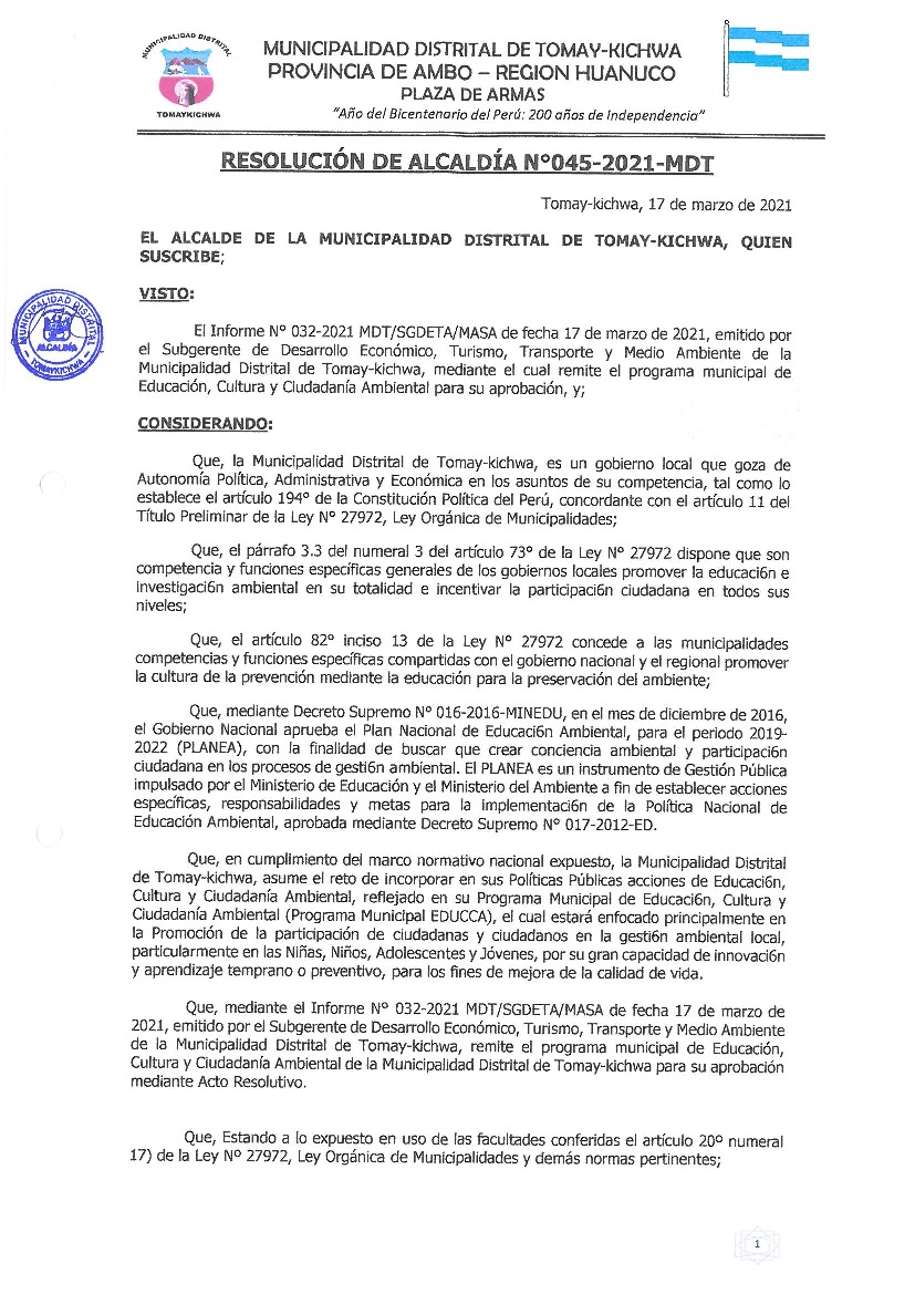 La presente Resolución aprueba el Programa Municipal de Educación, Cultura y Ciudadanía Ambiental de la Municipalidad Distrital de Tomay Kichwa, para el periodo 2021 - 2022; con la finalidad de promover la cultura y la educación ambiental para la formación de ciudadanas y ciudadanos ambientalmente responsables e incentivar la participación ciudadana en todos sus niveles.