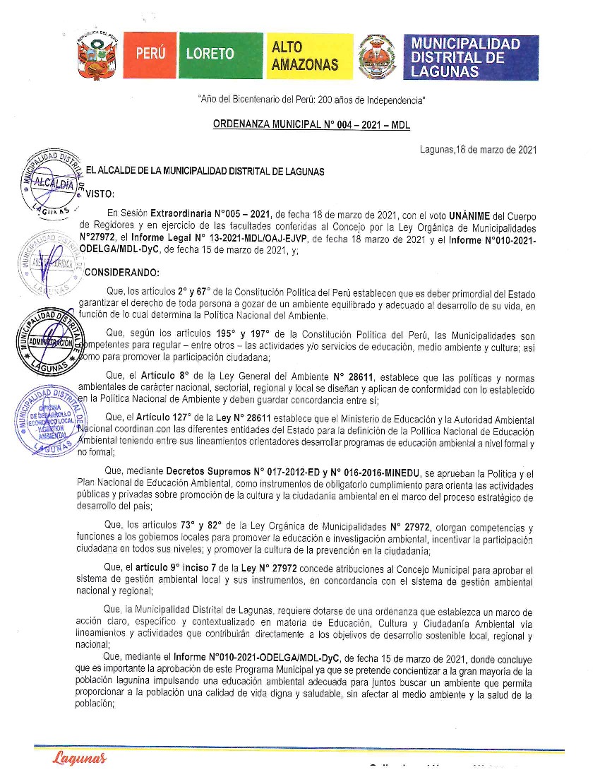 La presente Ordenanza aprueba el Programa Municipal de Educación, Cultura y Ciudadanía Ambiental de la Municipalidad Distrital de Lagunas, para el periodo 2021 - 2022; con la finalidad de promover la cultura y la educación ambiental para la formación de ciudadanas y ciudadanos ambientalmente responsables e incentivar la participación ciudadana en todos sus niveles.
