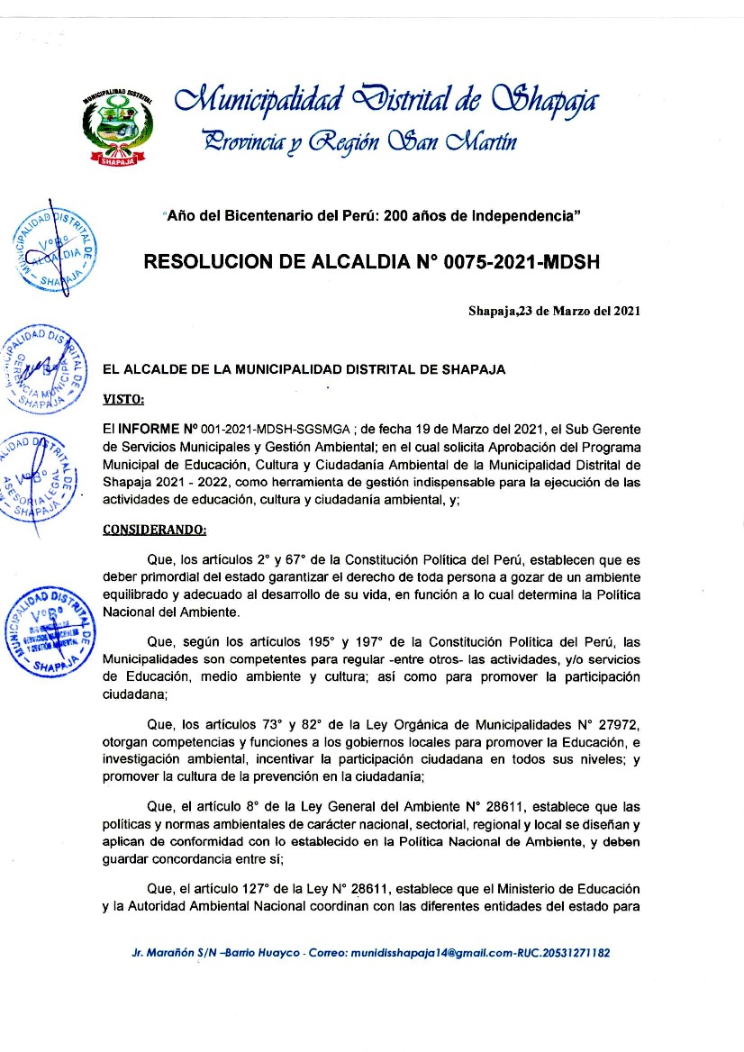 La presente Resolución aprueba el Programa Municipal de Educación, Cultura y Ciudadanía Ambiental de la Municipalidad Distrital de Shapaja, para el periodo 2021 - 2022; con la finalidad de promover la cultura y la educación ambiental para la formación de ciudadanas y ciudadanos ambientalmente responsables e incentivar la participación ciudadana en todos sus niveles.