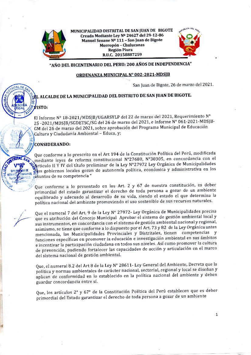 Programa Municipal de Educación, Cultura y Ciudadanía Ambiental de la Municipalidad Distrital de San Juan de Bigote 2021 – 2022