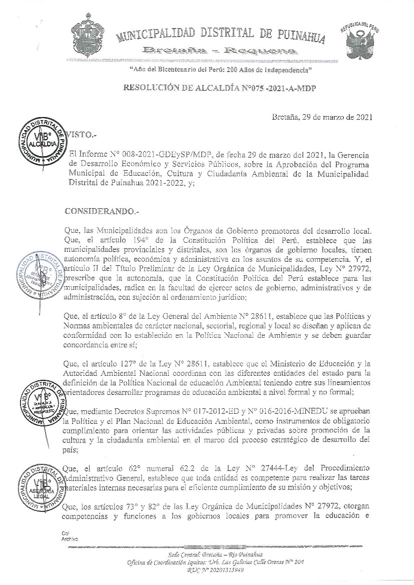 La presente Resolución aprueba el Programa Municipal de Educación, Cultura y Ciudadanía Ambiental de la Municipalidad Distrital de Puinahua, para el periodo 2021 - 2022; con la finalidad de promover la cultura y la educación ambiental para la formación de ciudadanas y ciudadanos ambientalmente responsables e incentivar la participación ciudadana en todos sus niveles.