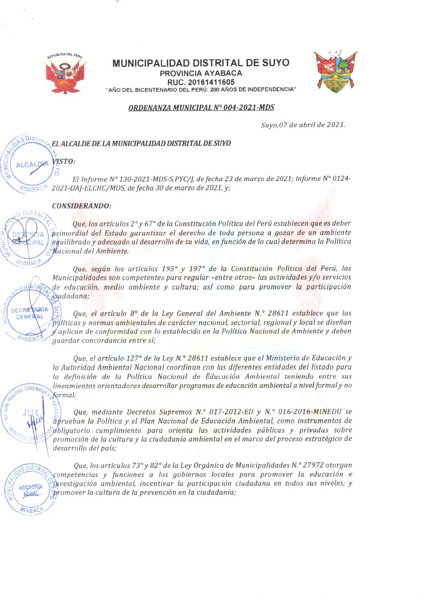 La presente Ordenanza aprueba el Programa Municipal de Educación, Cultura y Ciudadanía Ambiental de la Municipalidad Distrital de Suyo, para el periodo 2021 - 2022; con la finalidad de promover la cultura y la educación ambiental para la formación de ciudadanas y ciudadanos ambientalmente responsables e incentivar la participación ciudadana en todos sus niveles.
