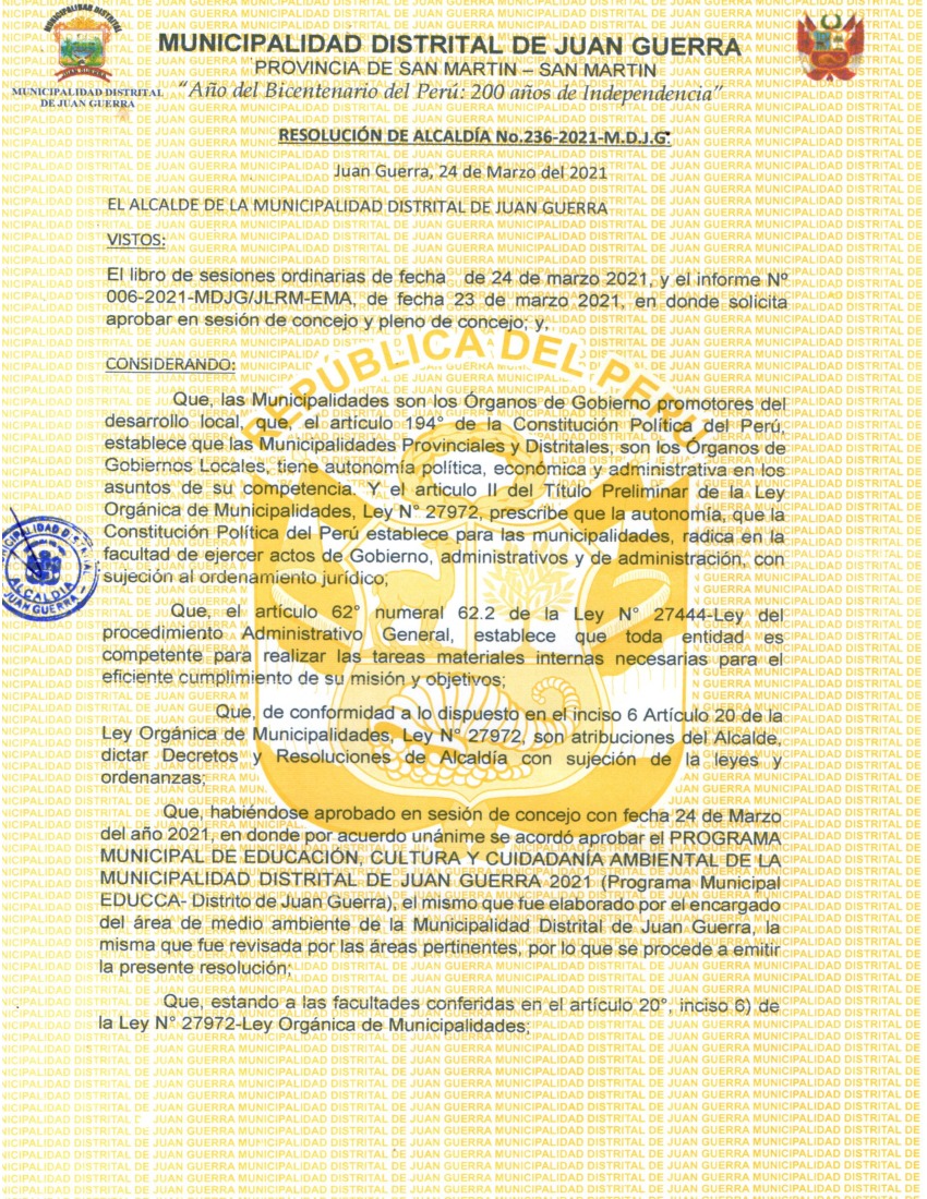 La presente Resolución aprueba el Programa Municipal de Educación, Cultura y Ciudadanía Ambiental de la Municipalidad Distrital de Juan Guerra, para el periodo 2021 - 2022; con la finalidad de promover la cultura y la educación ambiental para la formación de ciudadanas y ciudadanos ambientalmente responsables e incentivar la participación ciudadana en todos sus niveles.
