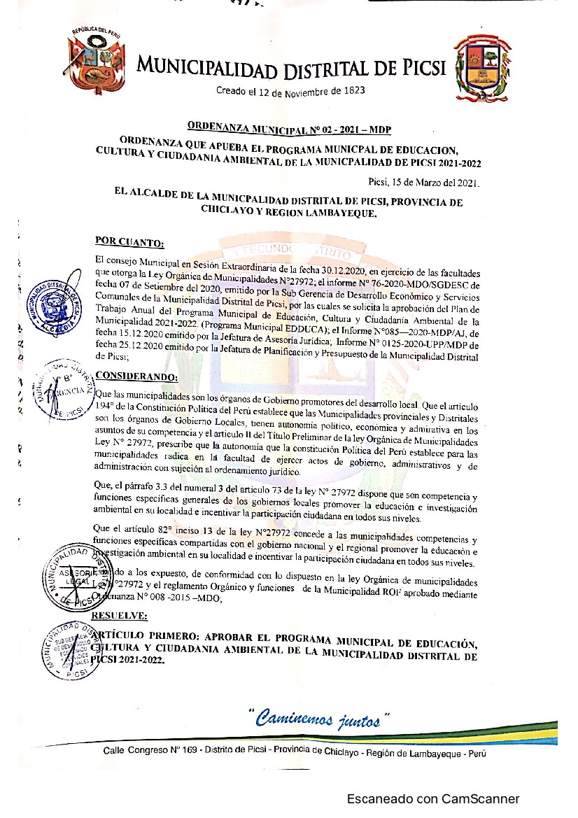 La presente Ordenanza aprueba el Programa Municipal de Educación, Cultura y Ciudadanía Ambiental de la Municipalidad Distrital de Picsi, para el periodo 2021 - 2022; con la finalidad de promover la cultura y la educación ambiental para la formación de ciudadanas y ciudadanos ambientalmente responsables e incentivar la participación ciudadana en todos sus niveles.