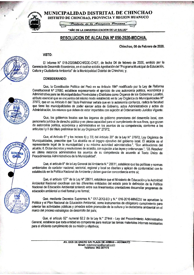 La presente Resolución aprueba el Programa Municipal de Educación, Cultura y Ciudadanía Ambiental de la Municipalidad Distrital de Chinchao, para el periodo 2020- 2022; con la finalidad de promover la cultura y la educación ambiental para la formación de ciudadanas y ciudadanos ambientalmente responsables e incentivar la participación ciudadana en todos sus niveles.