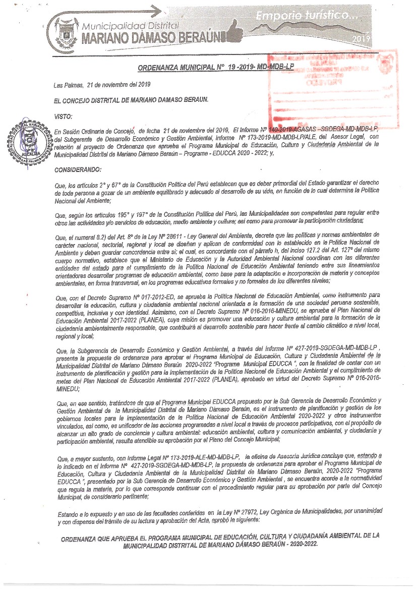 Programa Municipal de Educación, Cultura y Ciudadanía Ambiental de la Municipalidad Distrital de Mariano Dámaso Beraún 2019 - 2022