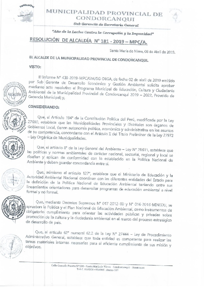 La presente Resolución aprueba el Programa Municipal de Educación, Cultura y Ciudadanía Ambiental de la Municipalidad Provincial de Condorcanqui, para el periodo 2019 - 2022; con la finalidad de promover la cultura y la educación ambiental para la formación de ciudadanas y ciudadanos ambientalmente responsables e incentivar la participación ciudadana en todos sus niveles.