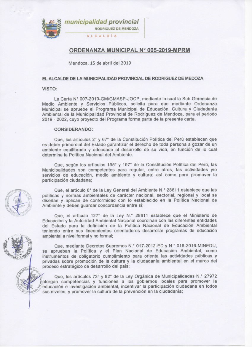 Programa Municipal de Educación, Cultura y Ciudadanía Ambiental de la Municipalidad Provincial Rodríguez de Mendoza de 2019 - 2022