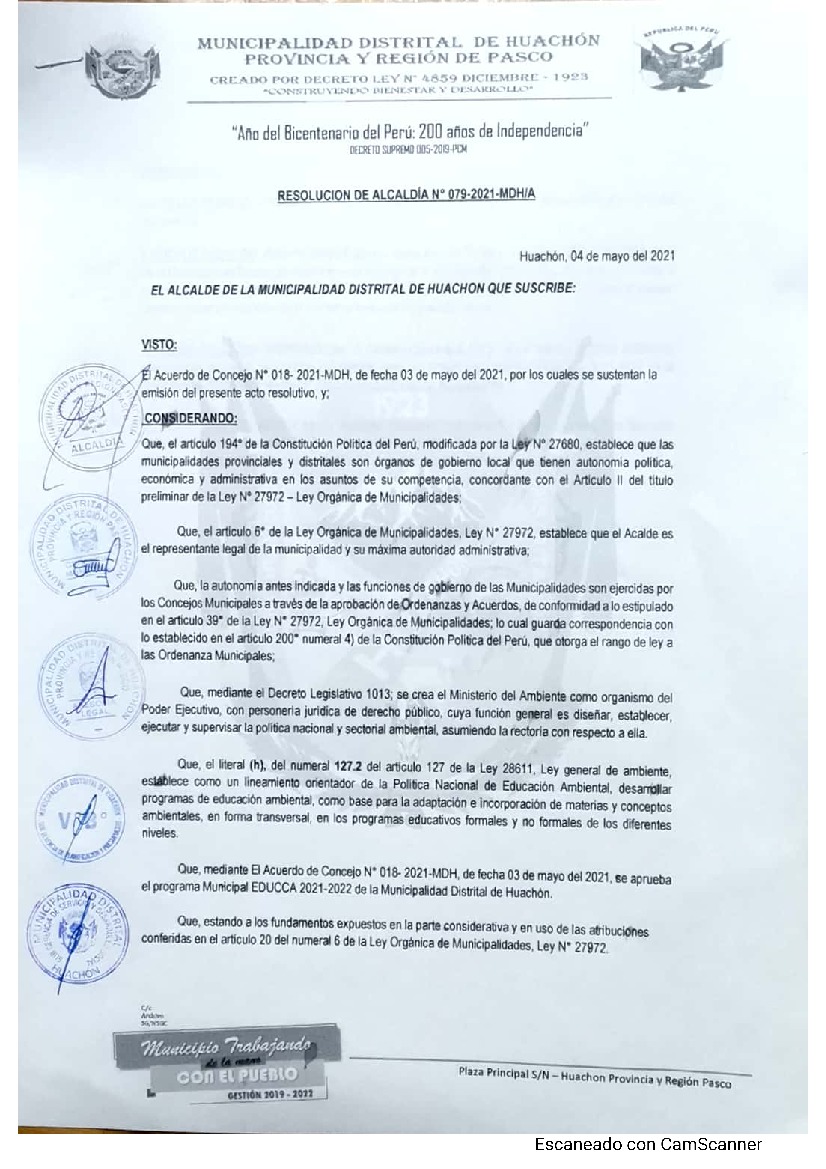 La presente Resolución aprueba el Programa Municipal de Educación, Cultura y Ciudadanía Ambiental de la Municipalidad Distrital de Huachón, para el periodo 2021- 2022; con la finalidad de promover la cultura y la educación ambiental para la formación de ciudadanas y ciudadanos ambientalmente responsables e incentivar la participación ciudadana en todos sus niveles.