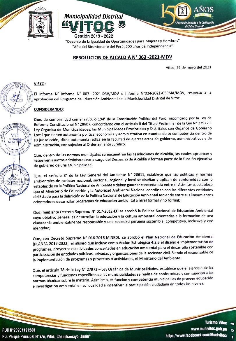 La presente Resolución aprueba el Programa Municipal de Educación, Cultura y Ciudadanía Ambiental de la Municipalidad Distrital de Vitoc, para el periodo 2021- 2022; con la finalidad de promover la cultura y la educación ambiental para la formación de ciudadanas y ciudadanos ambientalmente responsables e incentivar la participación ciudadana en todos sus niveles.
