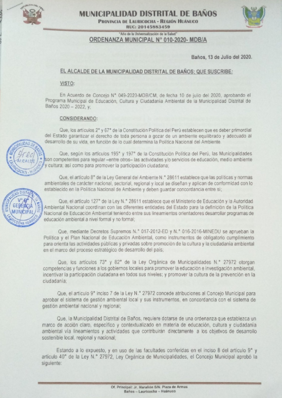 La presente Resolución aprueba el Programa Municipal de Educación, Cultura y Ciudadanía Ambiental de la Municipalidad Distrital de Baños, para el periodo 2020 - 2022; con la finalidad de promover la cultura y la educación ambiental para la formación de ciudadanas y ciudadanos ambientalmente responsables e incentivar la participación ciudadana en todos sus niveles.
