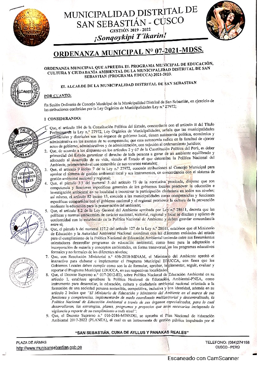 La2021 presente Ordenanza Municipal aprueba el Programa Municipal de Educación, Cultura y Ciudadanía Ambiental de la Municipalidad Distrital de San Sebastían la Provincia de Cusco para el periodo 2021-2022; con la finalidad de promover la cultura y la educación ambiental para la formación de ciudadanas y ciudadanos ambientalmente responsables e incentivar la participación ciudadana en todos sus niveles.