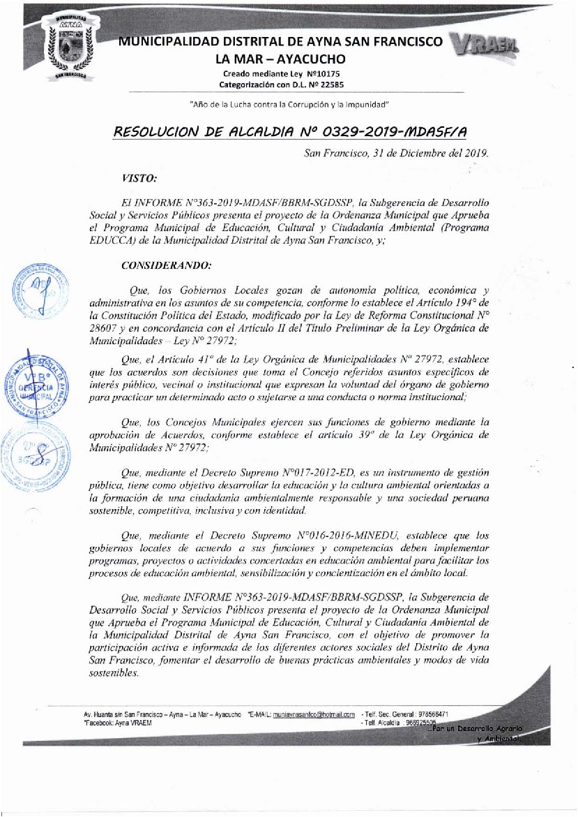 La presente Resolución aprueba el Programa Municipal de Educación, Cultura y Ciudadanía Ambiental de la Municipalidad Distrital de Ayna San Francisco, para el periodo 2019- 2022; con la finalidad de promover la cultura y la educación ambiental para la formación de ciudadanas y ciudadanos ambientalmente responsables e incentivar la participación ciudadana en todos sus niveles.