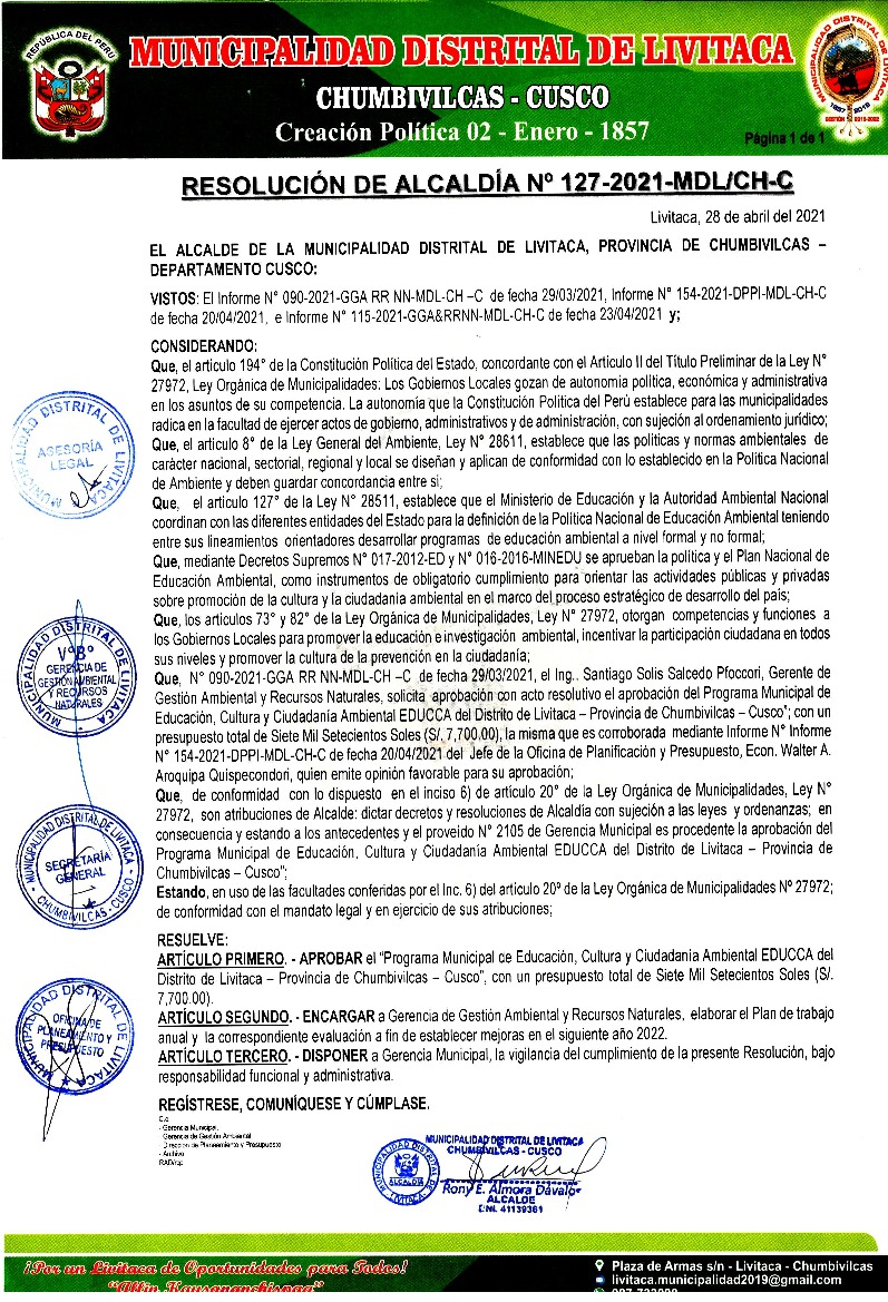 La presente Resolución, aprueba el Programa Municipal de Educación, Cultura y Ciudadanía Ambiental de la Municipalidad Distrital de Livitaca, para el periodo 2021-2022; con la finalidad de promover la cultura y la educación ambiental para la formación de ciudadanas y ciudadanos ambientalmente responsables e incentivar la participación ciudadana en todos sus niveles.