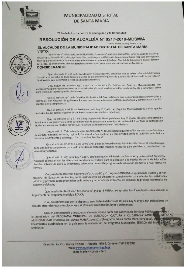 La presente Resolución aprueba el Programa Municipal de Educación, Cultura y Ciudadanía Ambiental de la Municipalidad Distrital de Santa María-Huaura, para el periodo 2019-2022; con la finalidad de promover la cultura y la educación ambiental para la formación de ciudadanas y ciudadanos ambientalmente responsables e incentivar la participación ciudadana en todos sus niveles.