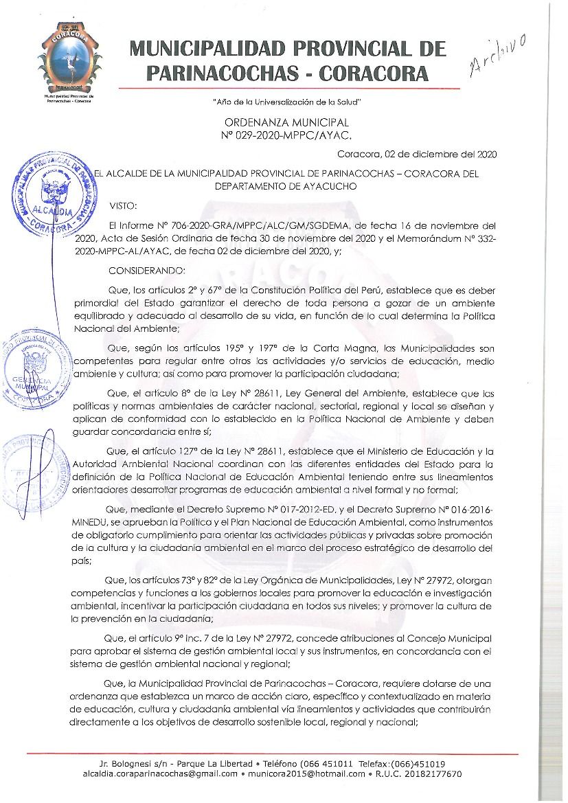 Programa Municipal de Educación, Cultura y Ciudadanía Ambiental de la Municipalidad Provincial de Parinacochas 2020-2022