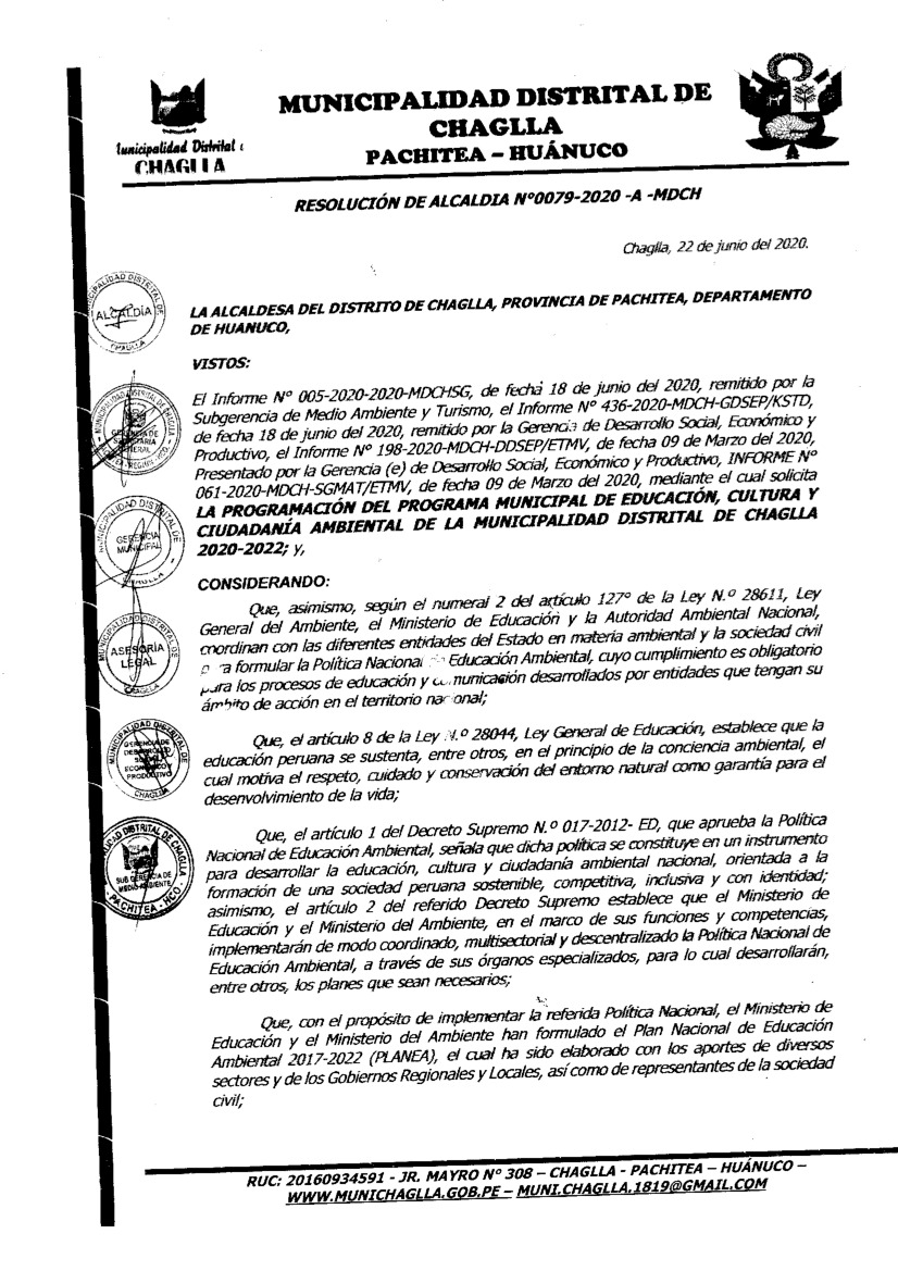 Programa Municipal de Educación, Cultura y Ciudadanía Ambiental de la Municipalidad Distrital de Chaglla 2020 - 2022