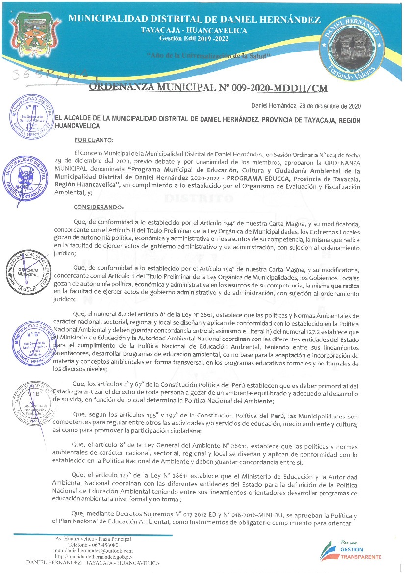La presente Ordenanza aprueba el Programa Municipal de Educación, Cultura y Ciudadanía Ambiental de la Municipalidad Distrital de Daniel Hernández, para el periodo 2020- 2022; con la finalidad de promover la cultura y la educación ambiental para la formación de ciudadanas y ciudadanos ambientalmente responsables e incentivar la participación ciudadana en todos sus niveles.