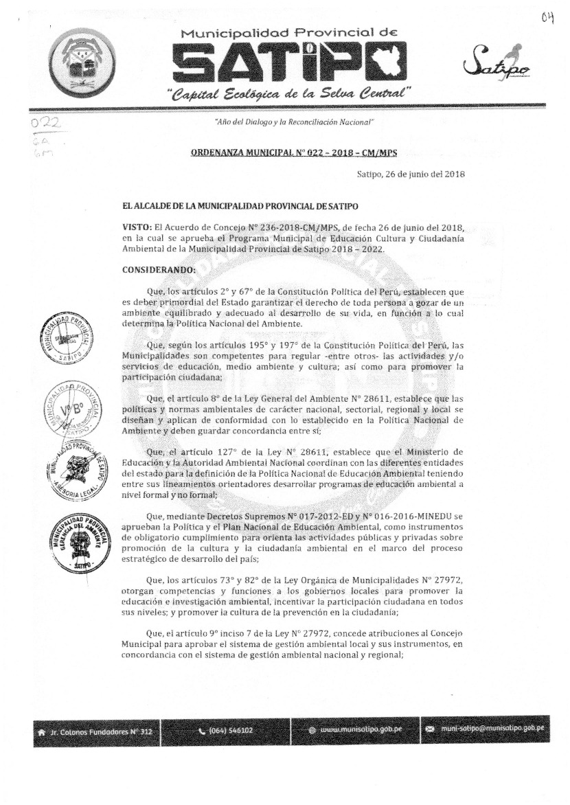 Programa Municipal de Educación, Cultura y Ciudadanía Ambiental de la Municipalidad Provincial de Satipo 2018-2022