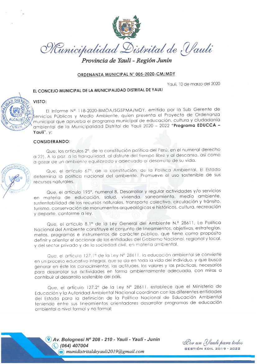 Programa Municipal de Educación, Cultura y Ciudadanía Ambiental de la Municipalidad Distrital de Yauli 2020-2022