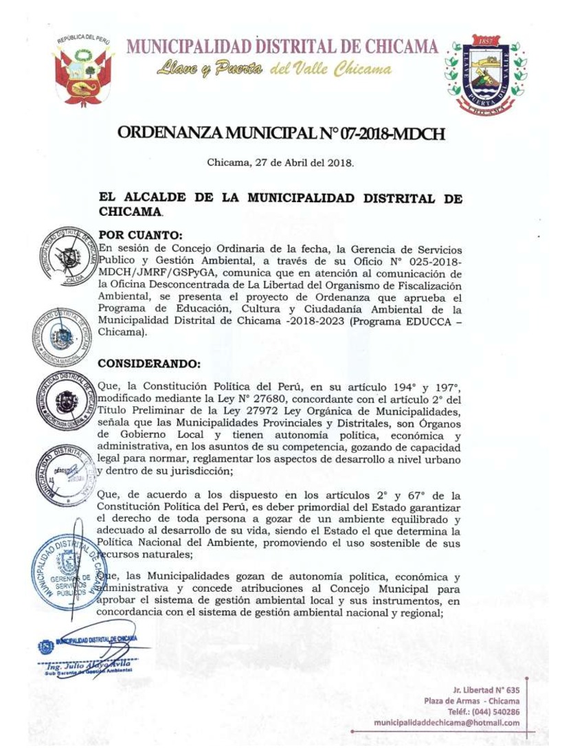La presente Ordenanza aprueba el Programa Municipal de Educación, Cultura y Ciudadanía Ambiental de la Municipalidad Distrital de Chicama, para el periodo 2018- 2022; con la finalidad de promover la cultura y la educación ambiental para la formación de ciudadanas y ciudadanos ambientalmente responsables e incentivar la participación ciudadana en todos sus niveles.
