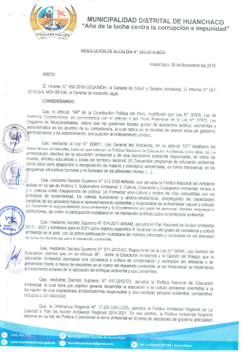 La presente Resolución aprueba el Programa Municipal de Educación, Cultura y Ciudadanía Ambiental de la Municipalidad Distrital de Huanchaco, para el periodo 2019- 2022; con la finalidad de promover la cultura y la educación ambiental para la formación de ciudadanas y ciudadanos ambientalmente responsables e incentivar la participación ciudadana en todos sus niveles.