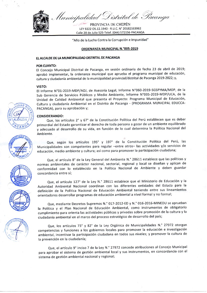 Programa Municipal de Educación, Cultura y Ciudadanía Ambiental de la Municipalidad Distrital de Pacanga 2019-2022