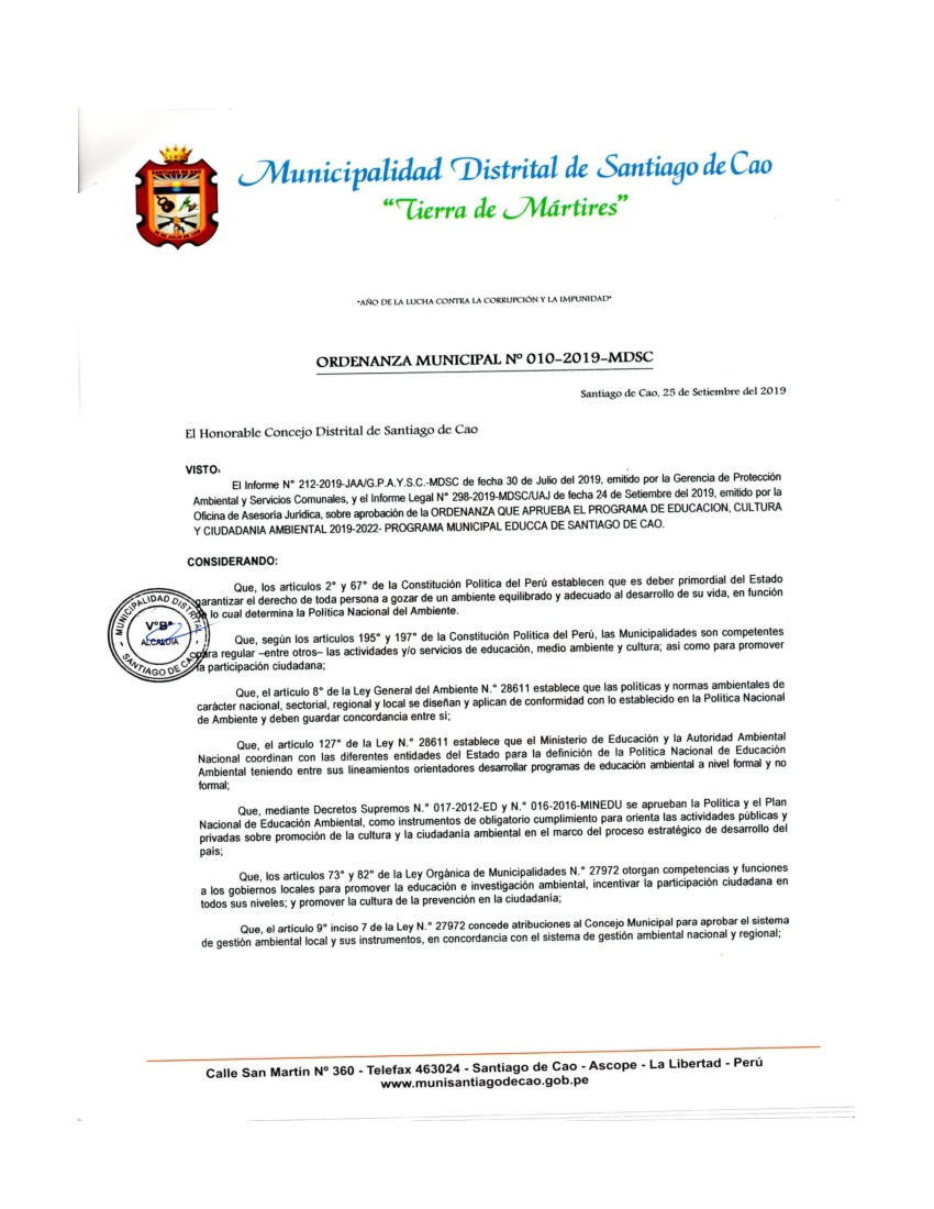 Programa Municipal de Educación, Cultura y Ciudadanía Ambiental de la Municipalidad Distrital de Santiago de Cao 2019-2022