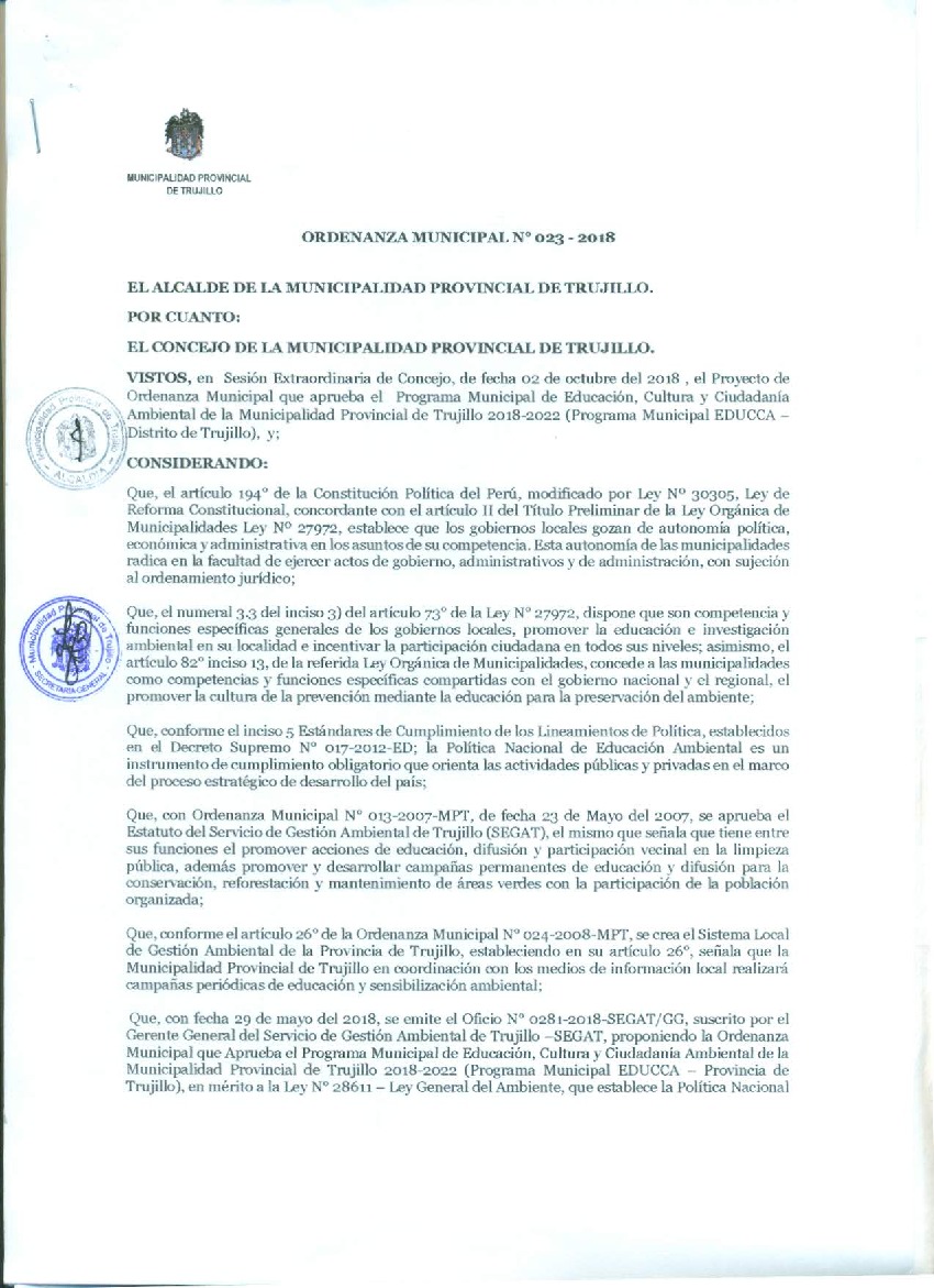 La presente Ordenanza aprueba el Programa Municipal de Educación, Cultura y Ciudadanía Ambiental de la Municipalidad Provincial de Trujillo, para el periodo 2018- 2022; con la finalidad de promover la cultura y la educación ambiental para la formación de ciudadanas y ciudadanos ambientalmente responsables e incentivar la participación ciudadana en todos sus niveles.