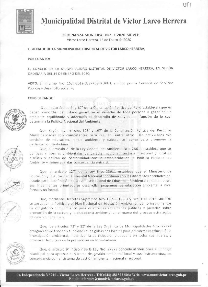 La presente Ordenanza aprueba el Programa Municipal de Educación, Cultura y Ciudadanía Ambiental de la Municipalidad Distrital de Víctor Larco Herrera, para el periodo 2020- 2022; con la finalidad de promover la cultura y la educación ambiental para la formación de ciudadanas y ciudadanos ambientalmente responsables e incentivar la participación ciudadana en todos sus niveles.