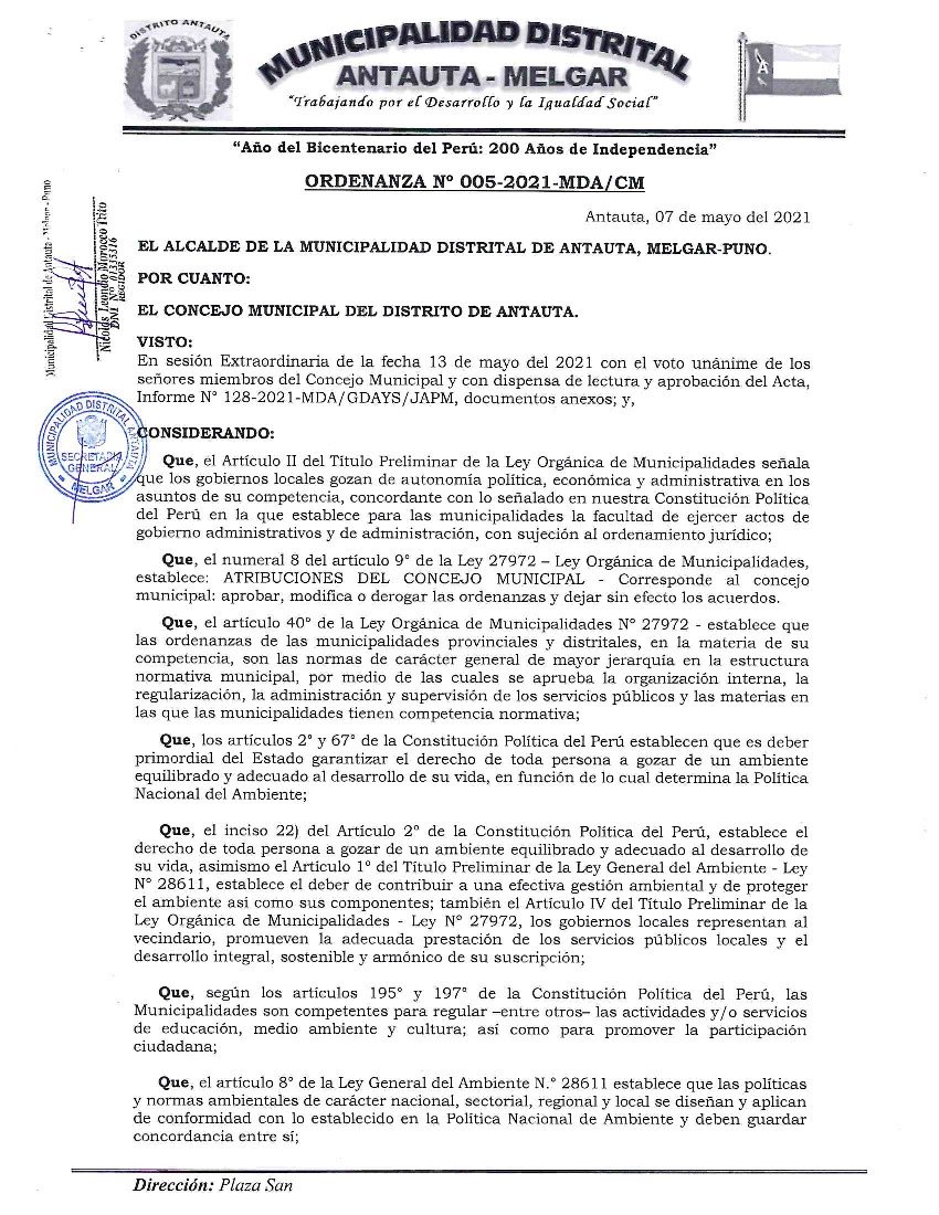 La presente Ordenanza aprueba el Programa Municipal de Educación, Cultura y Ciudadanía Ambiental de la Municipalidad Distrital de Antauta, para el periodo 2021- 2022; con la finalidad de promover la cultura y la educación ambiental para la formación de ciudadanas y ciudadanos ambientalmente responsables e incentivar la participación ciudadana en todos sus niveles.