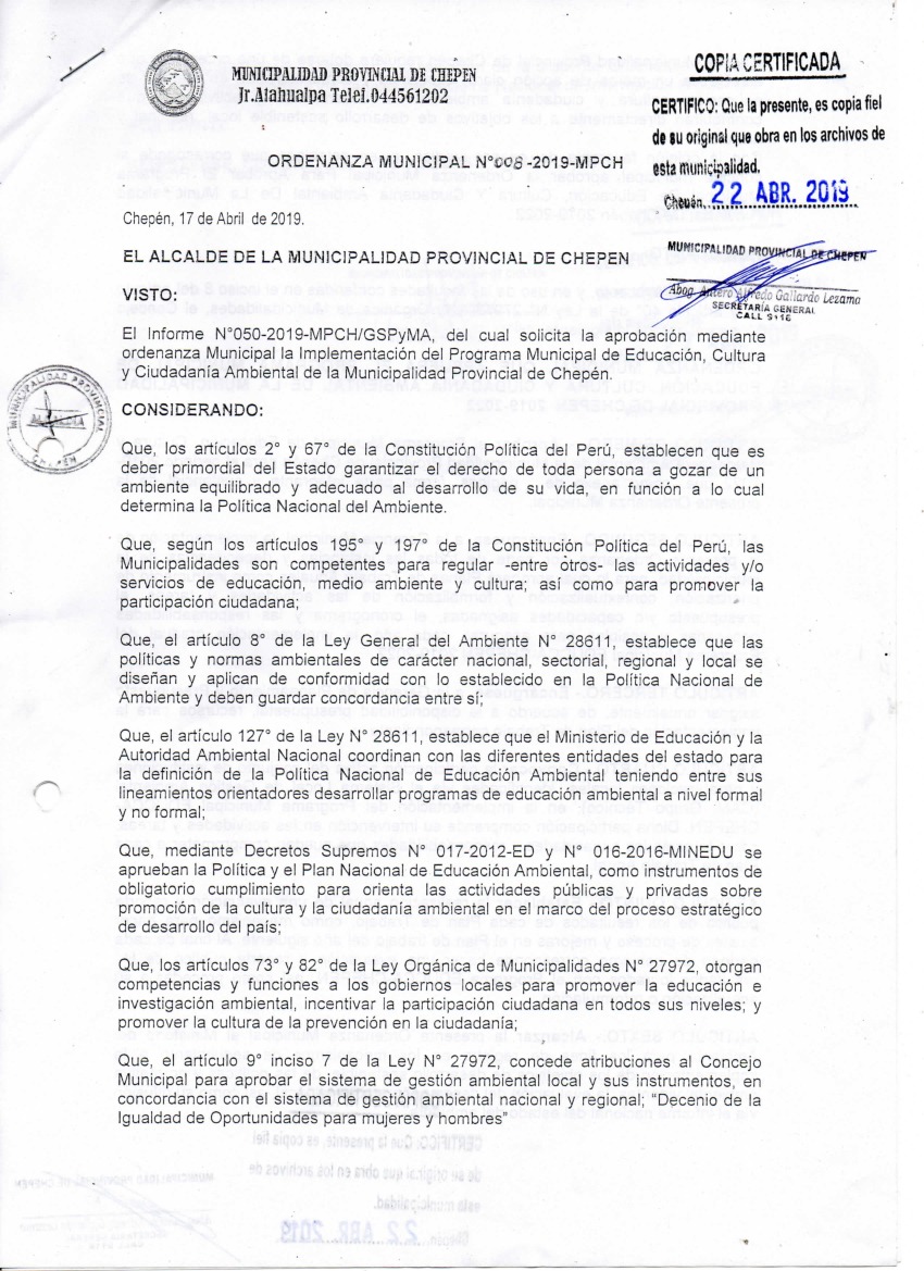 La presente Ordenanza aprueba el Programa Municipal de Educación, Cultura y Ciudadanía Ambiental de la Municipalidad Provincial de Chepén, para el periodo 2019- 2022; con la finalidad de promover la cultura y la educación ambiental para la formación de ciudadanas y ciudadanos ambientalmente responsables e incentivar la participación ciudadana en todos sus niveles.