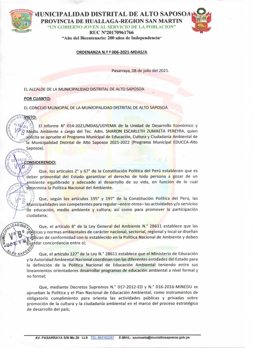 La presente Ordenanza aprueba el Programa Municipal de Educación, Cultura y Ciudadanía Ambiental de la Municipalidad Distrital de Alto Saposoa, para el periodo 2021 - 2022; con la finalidad de promover la cultura y la educación ambiental para la formación de ciudadanas y ciudadanos ambientalmente responsables e incentivar la participación ciudadana en todos sus niveles.