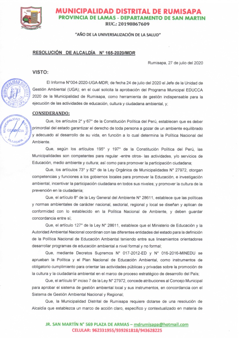 Programa Municipal de Educación, Cultura y Ciudadanía Ambiental de la Municipalidad Distrital de Rumisapa 2020 - 2022