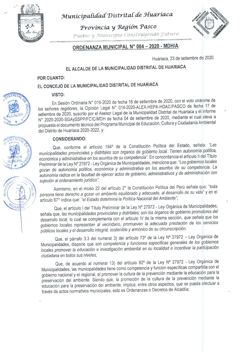 Programa Municipal de Educación, Cultura y Ciudadanía Ambiental de la Municipalidad Distrital de Huariaca 2020-2022