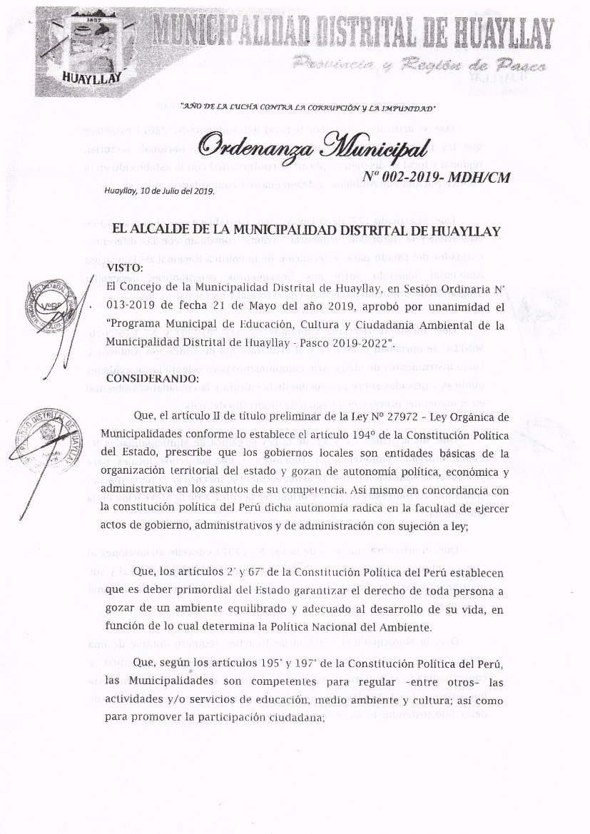Programa Municipal de Educación, Cultura y Ciudadanía Ambiental de la Municipalidad Distrital de Huayllay 2019-2022