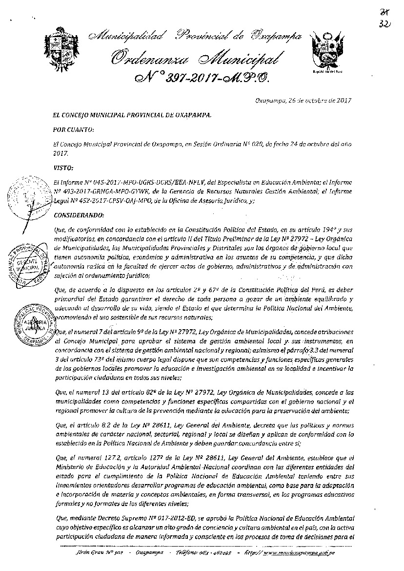 La presente Ordenanza aprueba el Programa Municipal de Educación, Cultura y Ciudadanía Ambiental de la Municipalidad Provincial de Oxapampa, para el periodo 2017- 2022; con la finalidad de promover la cultura y la educación ambiental para la formación de ciudadanas y ciudadanos ambientalmente responsables e incentivar la participación ciudadana en todos sus niveles.