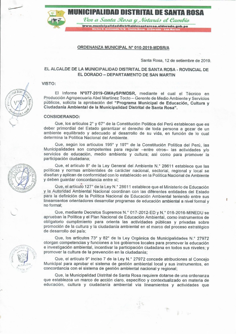 Programa Municipal de Educación, Cultura y Ciudadanía Ambiental de la Municipalidad Distrital de Santa Rosa 2019 - 2022