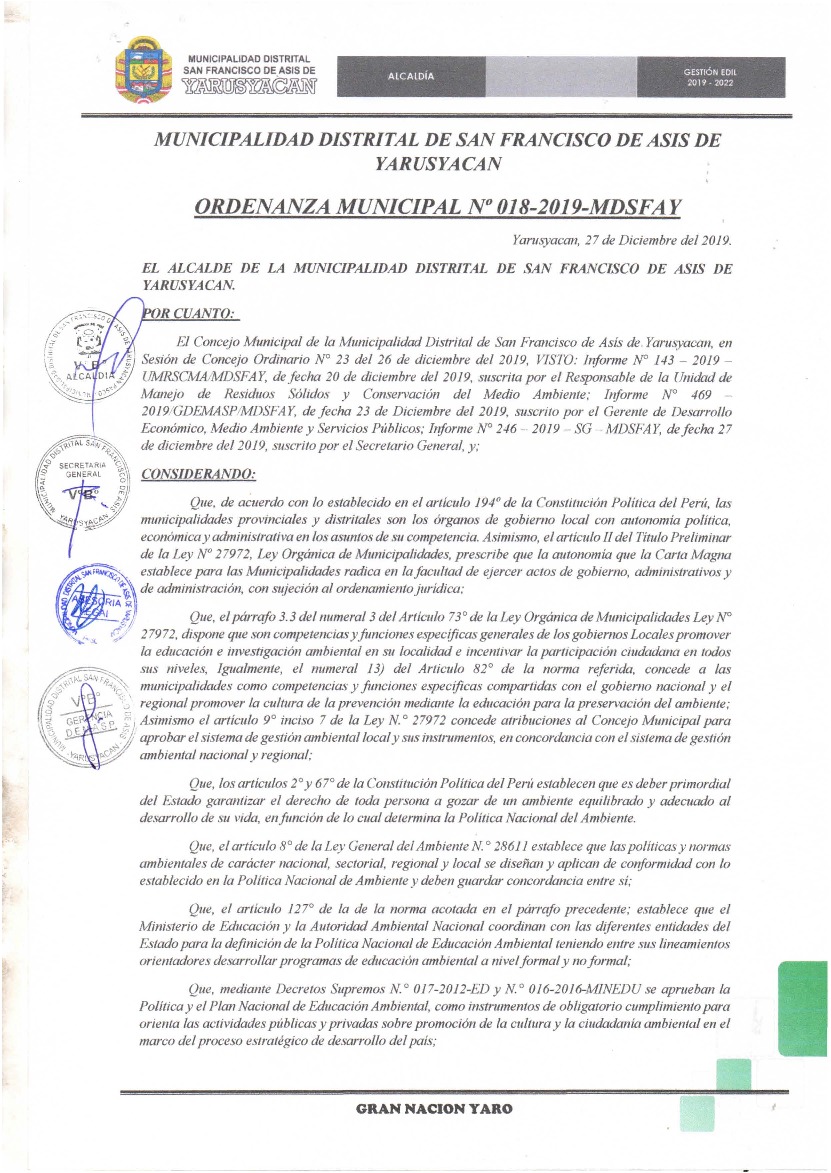 Programa Municipal de Educación, Cultura y Ciudadanía Ambiental de la Municipalidad Distrital de San Francisco de Asís de Yarusyacan 2019-2022