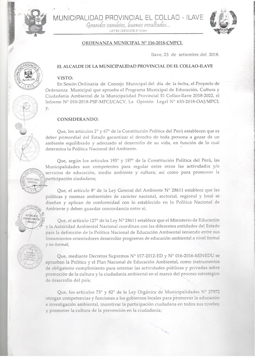 Programa Municipal de Educación, Cultura y Ciudadanía Ambiental de la Municipalidad Provincial de El Collao 2018-2022