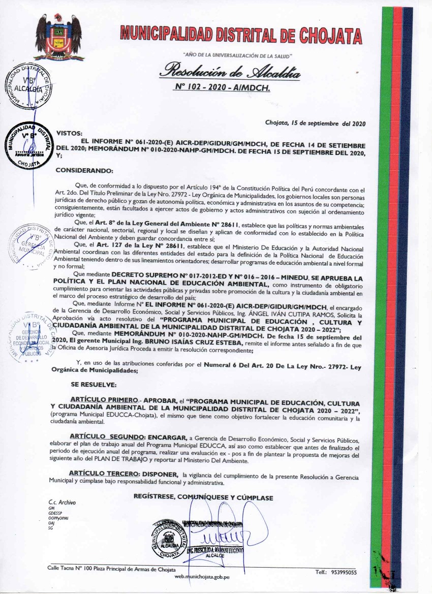 Programa Municipal de Educación, Cultura y Ciudadanía Ambiental de la Municipalidad Distrital de Chojata 2020- 2022