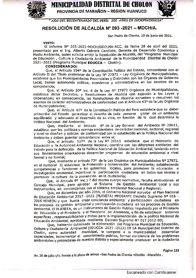 La presente Resolución aprueba el Programa Municipal de Educación, Cultura y Ciudadanía Ambiental de la Municipalidad Distrital de Cholón, para el periodo 2021 - 2022; con la finalidad de promover la cultura y la educación ambiental para la formación de ciudadanas y ciudadanos ambientalmente responsables e incentivar la participación ciudadana en todos sus niveles.