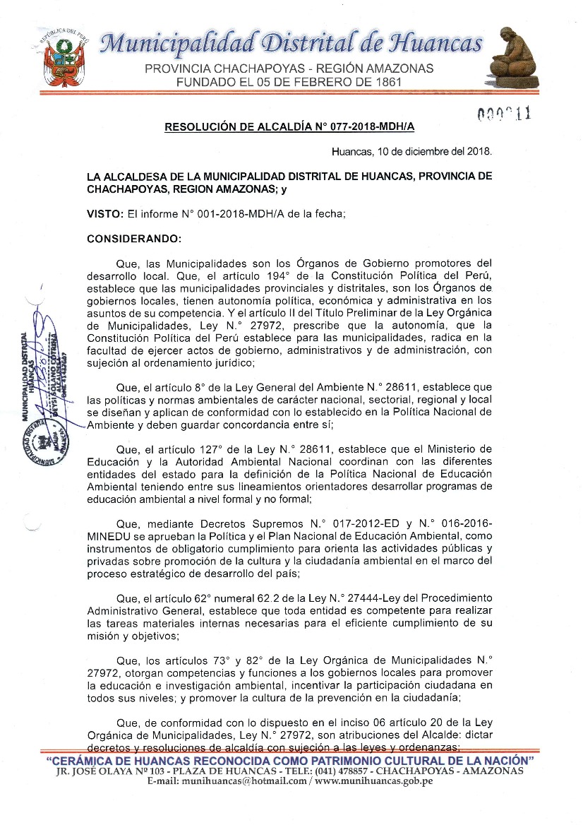 Programa Municipal de Educación, Cultura y Ciudadanía Ambiental de la Municipalidad Distrital de Huancas 2019 - 2022