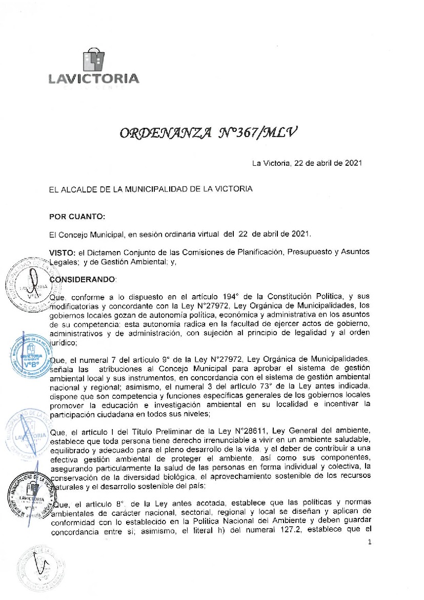 La presente Ordenanza aprueba el Programa Municipal de Educación, Cultura y Ciudadanía Ambiental de la Municipalidad Distrital de La Victoria, para el periodo 2021 - 2022; con la finalidad de promover la cultura y la educación ambiental para la formación de ciudadanas y ciudadanos ambientalmente responsables e incentivar la participación ciudadana en todos sus niveles.