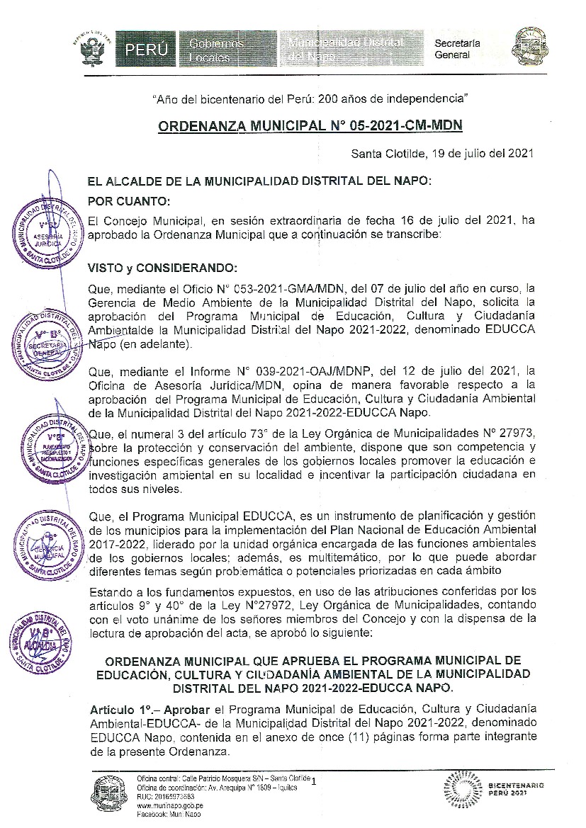 Programa Municipal de Educación, Cultura y Ciudadanía Ambiental de la Municipalidad Distrital de Napo 2021 – 2022